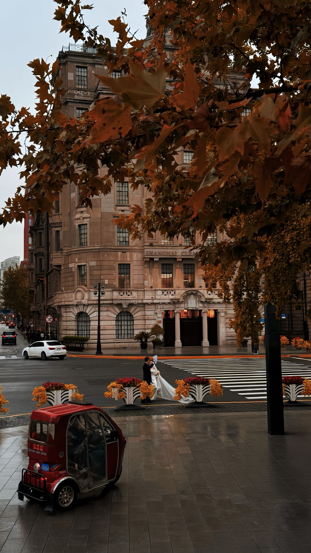 In Shanghai, fantasy meets reality. Framed by autumn leaves, a couple's wedding bliss unfolds amidst the city's living rhythm. A candid snapshot of love finding its way through the urban hustle, symbolizing the journey of life in a metropolis.