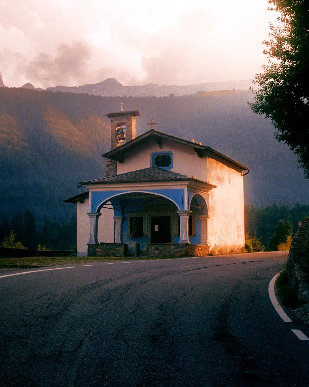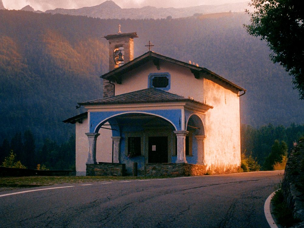 A small roadside church in the Italian Alps lit by the setting sun. the Italian alps where most of the population is catholic are peppered with small villages in between the mountains who all have small churches.