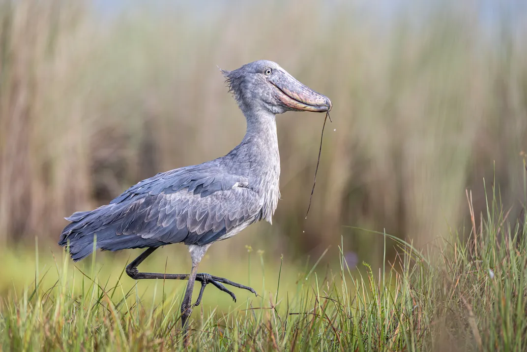 Taken in the early morning light of the swamp near Entebbe - this shoebill stands motionless on one leg in the shallow marsh. Its imposing, shoe-shaped bill grasps a stalk of aquatic vegetation, droplets of water sliding off as it surveys its swampy domain. The stillness and solitude of the moment reveal the prehistoric elegance of one of Africa´s rarest birds, deep in the papyrus-covered floodplain.