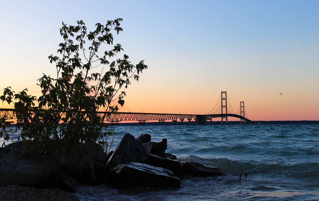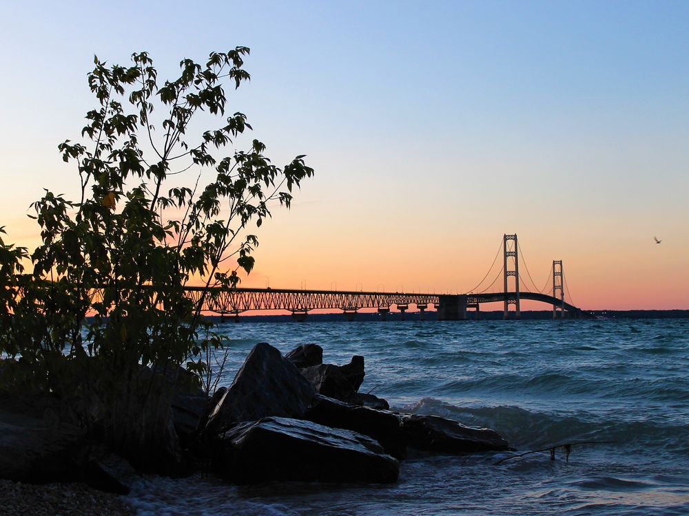 A summer sunset over Lake Huron, Lake Michigan and the Mackinac Bridge from Mackinaw City, Michigan.