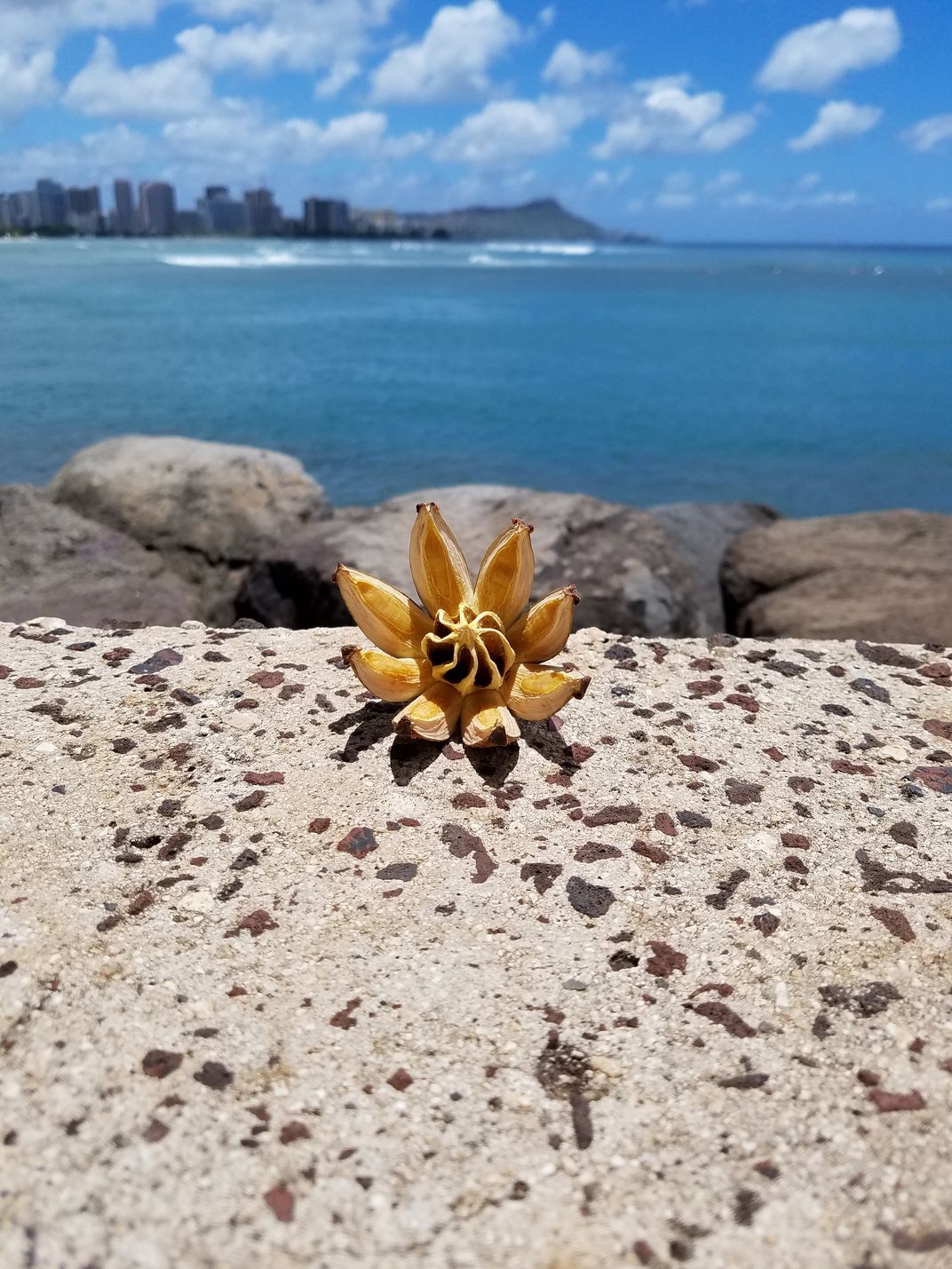 Mahogany seed pod with Waikiki and Diamond Head in the background.