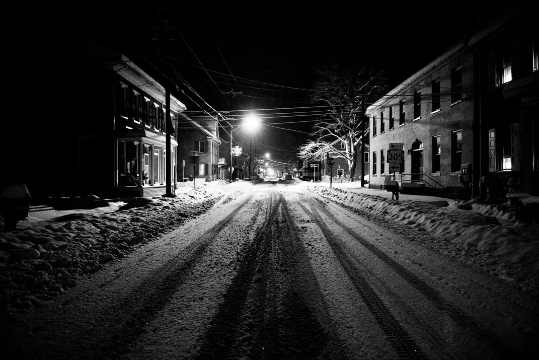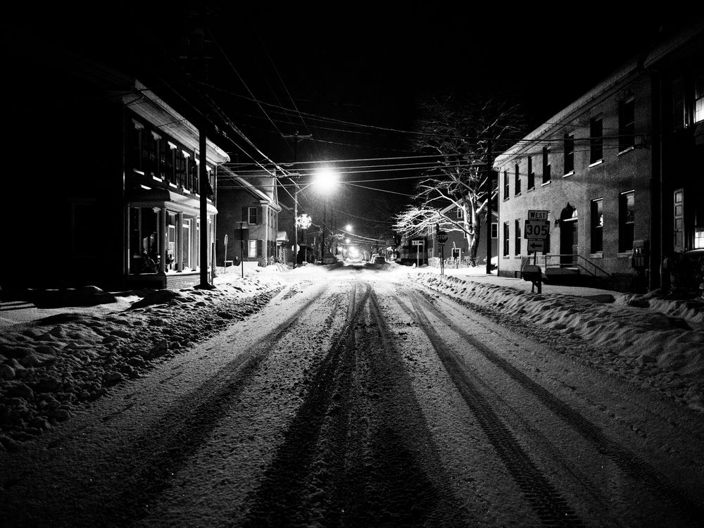 A December snowstorm was predicted to drop 20 inches of snow on central Pennsylvania. At 2am in the morning, I went out with my camera and boots seeking to document how the storm would blanket our little borough in white before the clean-up began. This photo is of the main 4-way stop in Alexandria, Pennsylvania. It was so quiet, you could hear the snow landing on the ground.