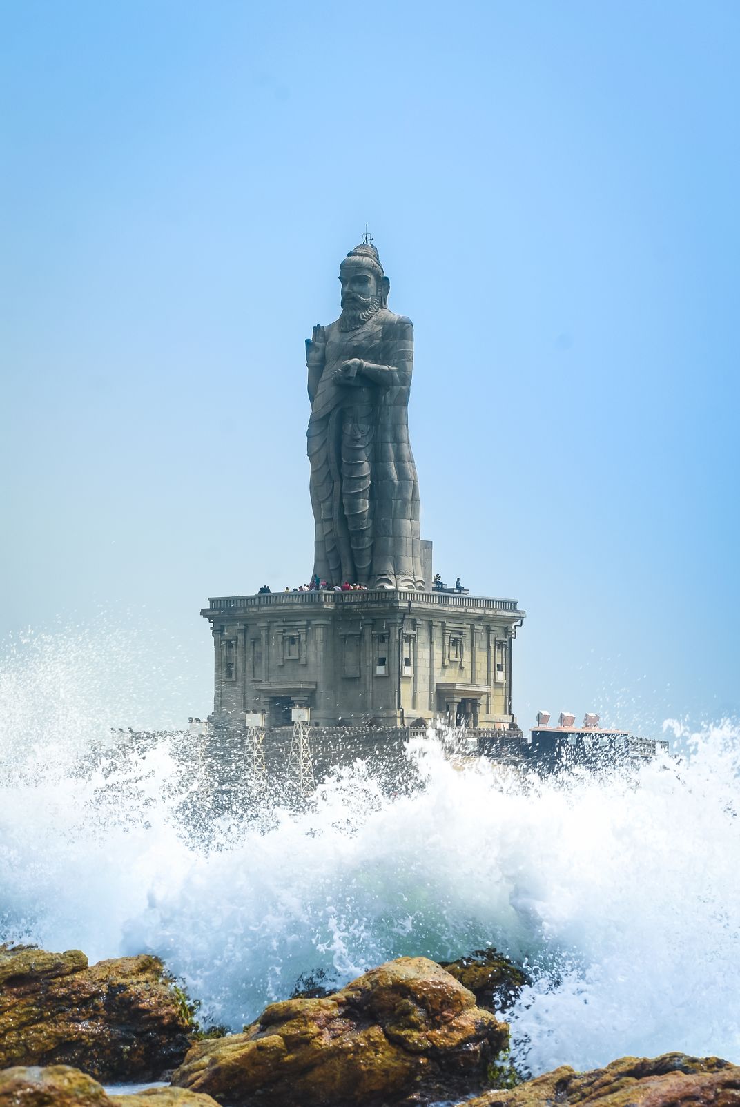 Saint Thiruvalluvar statue is a 133 feet (40.6 meters) tall stone sculpture of the famous Tamil poet and philosopher located on small island near Kanyakumari, the southern tip of India's mainland. This gigantic 7000 tons statue was built by the government of Tamil Nadu in honour of the Saint which is now one of the key attractions. This stone sculpture has been made in a 38 feet long pedestal. The 38 feet of the pedestal represents the 38 chapters of the virtue and the total 133 feet represents the 133 chapters in Thirukkural - the sacred couplets.