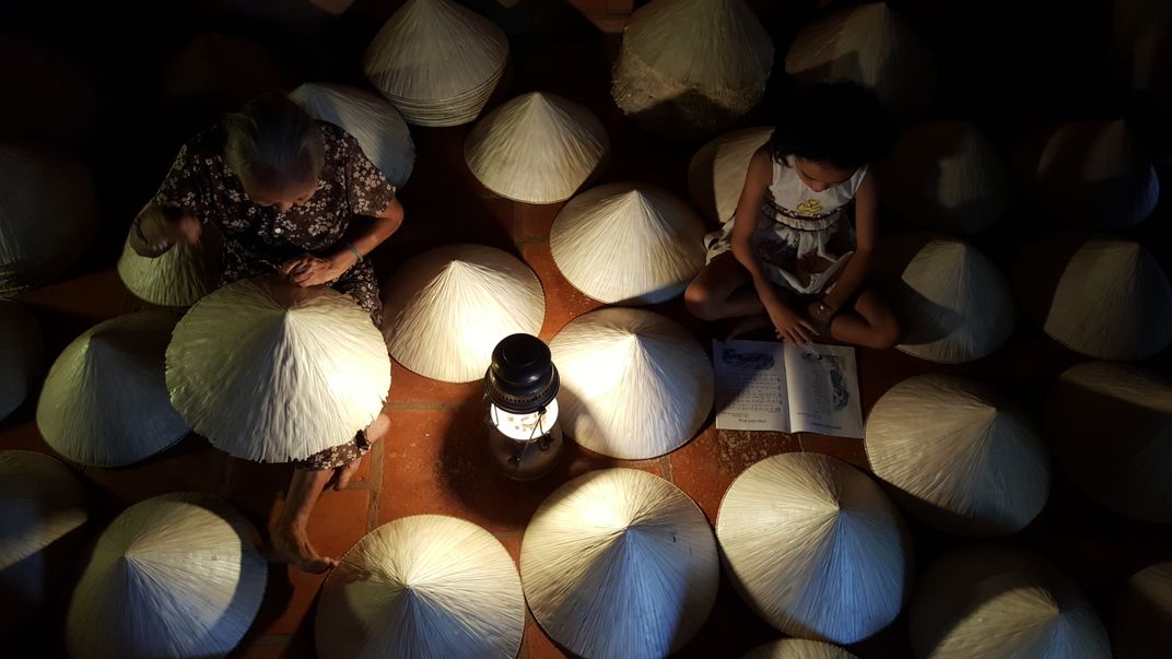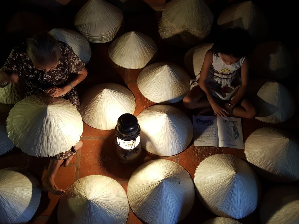 old woman is handy making coconut's leaves hat with her granddaughter is studying in low light.