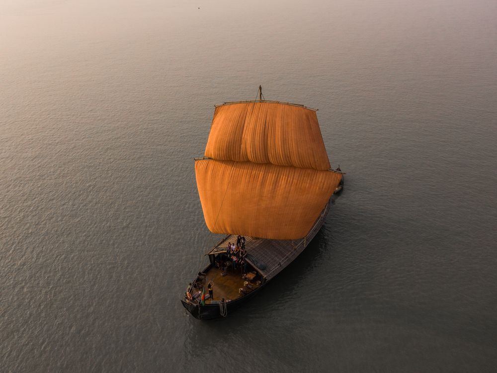 In 1997 we converted one of the largest wooden hulls of the country, built according to the thousand year-old techniques of the Brahmaputra carpenters, into an international standard cruising boat. The B613 is a Malar boat, measuring 93 feet in length and 23 feet in width. She is equipped with 6 double cabins, 4 bathrooms, 2 showers and a large well-equipped kitchen. The original rigging has been rebuilt with a 20m high mast and two magnificent hand woven red-ochre trapezoidal sails that measure a total surface of 250 square metres, making the B613 the largest sailing boat of Bengal. The Burmese teak deck measures 11m in length and 6.5m wide, and part of the deck is sheltered from the sun by the beginnings of a bamboo roof. The boat is also equipped with two diesel engines (of 110 hp each which are silent – hardly any vibrations can be felt. Clipboards and blackboards can be used without any problems.) The B613 has chairs and tables and a generator for using projectors, microphones and other equipment for seminars, meetings and retreats. The open roof and sides can also be covered effectively, in case of rain or if the rooms need to be darkened.