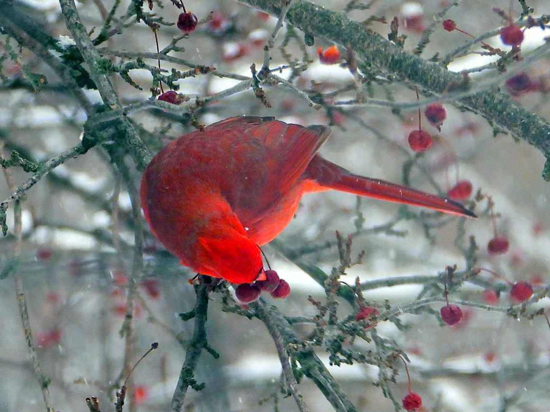 It was a gray overcast day with snow flurries when I shot this through two window panes in our back yard. The male cardinal had lowered its head to snack on a crab apple which I was not expecting to see. The moment was so sudden and glad I catch it before it was gone.