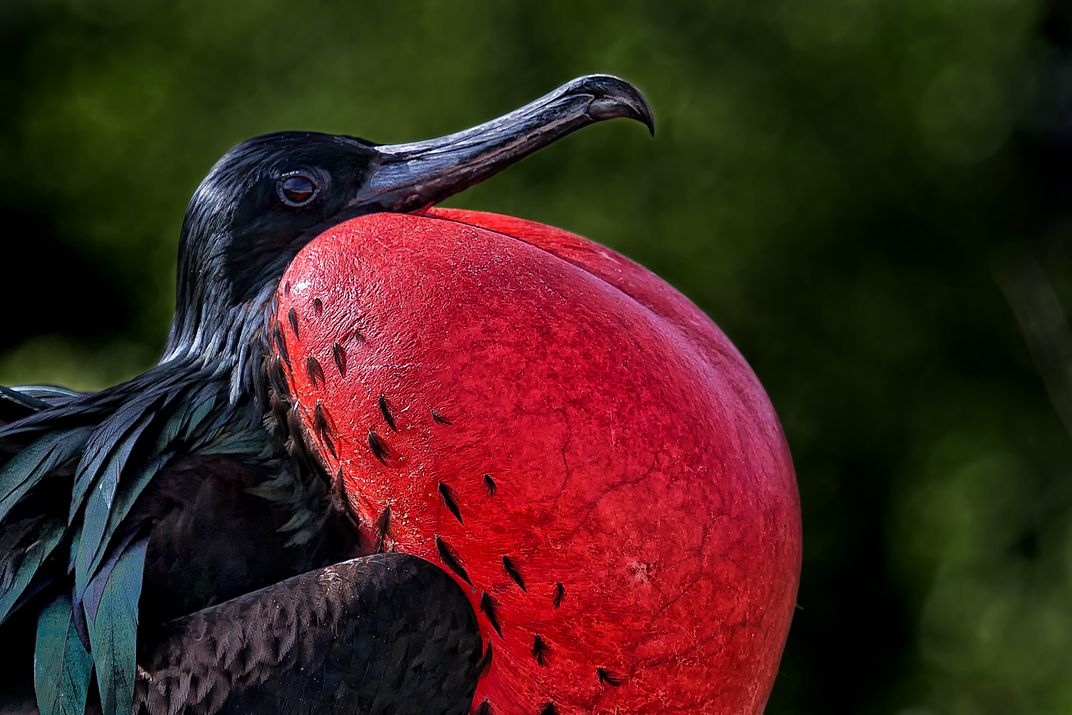 A male great frigatebird displaying to females flying overhead by inflating his gular sac.