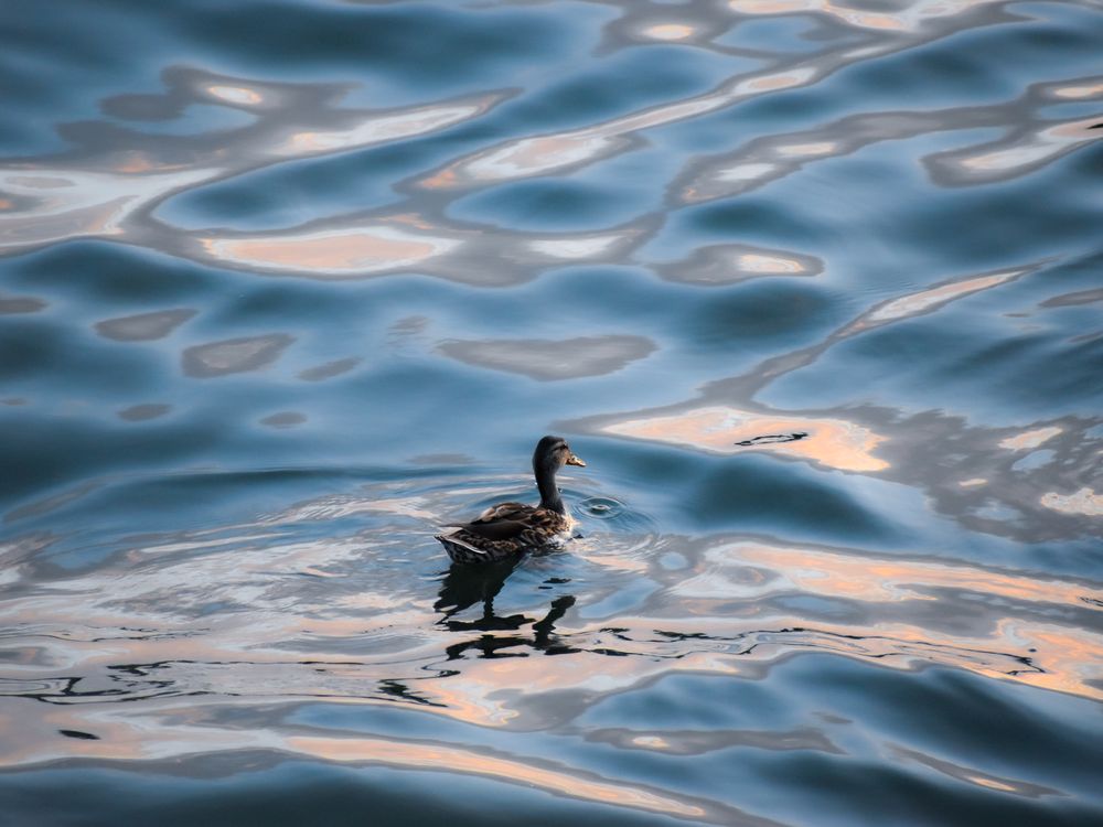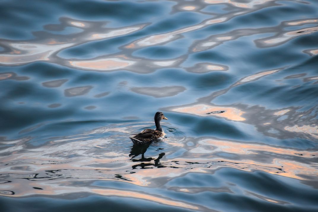 A beautiful duck swimming on the magical surface of the river Sava in Belgrade, Serbia during the golden hour.