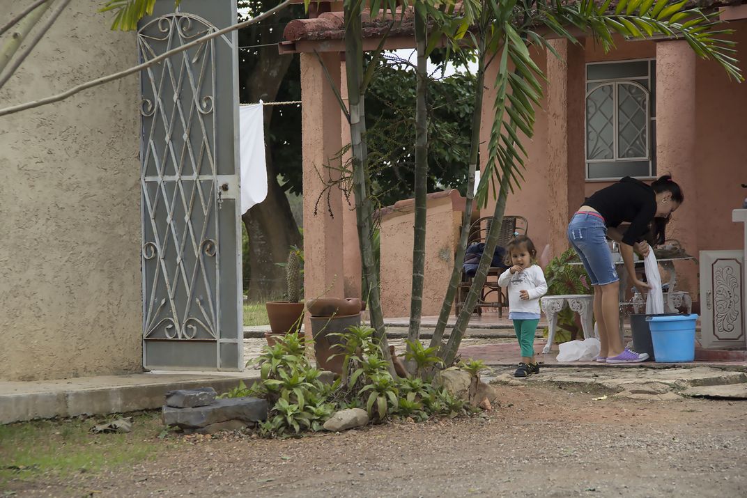 A young Cuban girl out with her mother doing laundry.