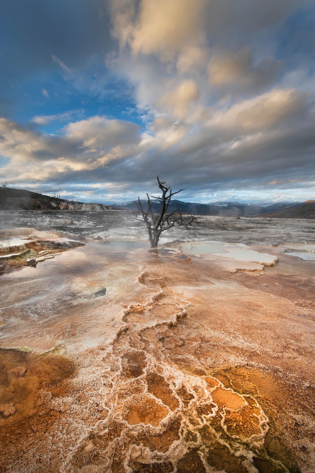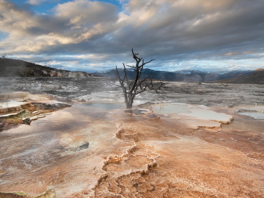 Dead trees entombed in travertine deposits colored by thermophilic bacteria. Upper Terraces of Mammoth Hot Springs, Yellowstone National Park