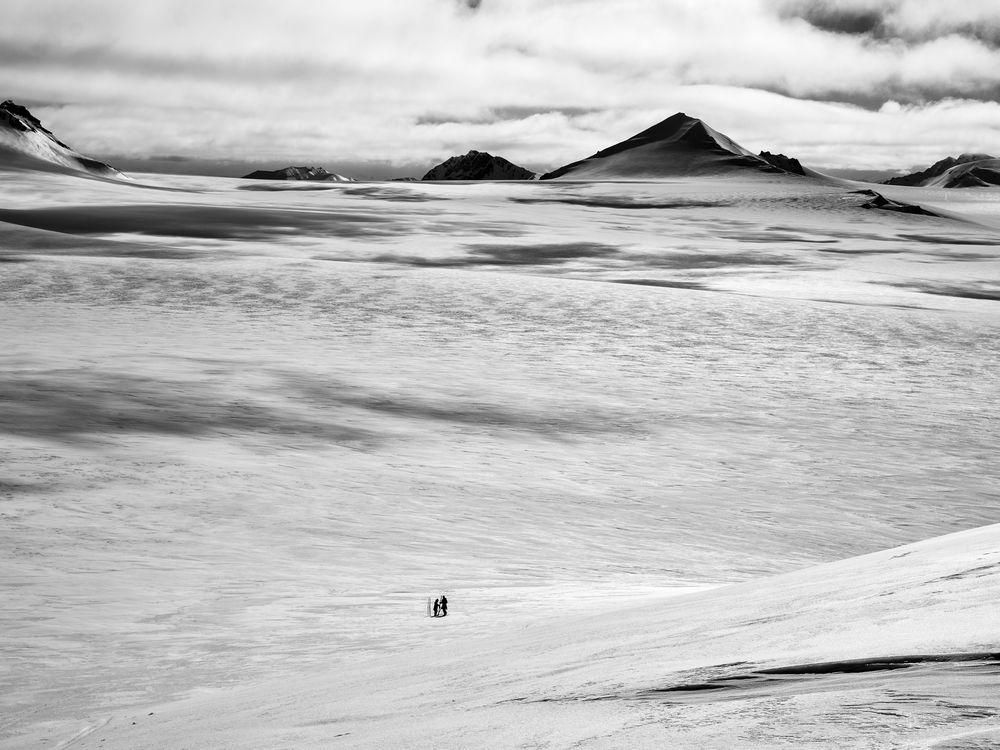 Skiers adjust their equipment on the large untouched surface of the glacier plateau of Trollheimen. The sun is somewhat obscured by clouds creating moving figures on the snow surface. Taken during a week ski trip on Svalbard in June.