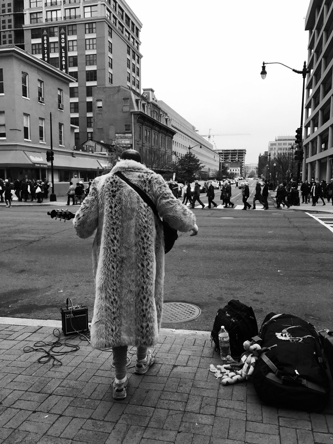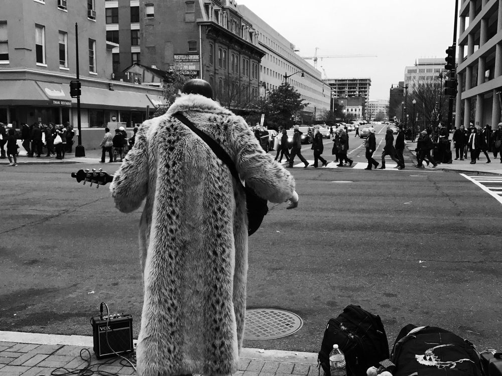 During the 2016 women's march in Washington, D.C, this man in a fur coat came out and played his guitar and sung to the protesters on a back street in gallery place china town. He actually had on pink sweatpants, and a furry pink scarf.