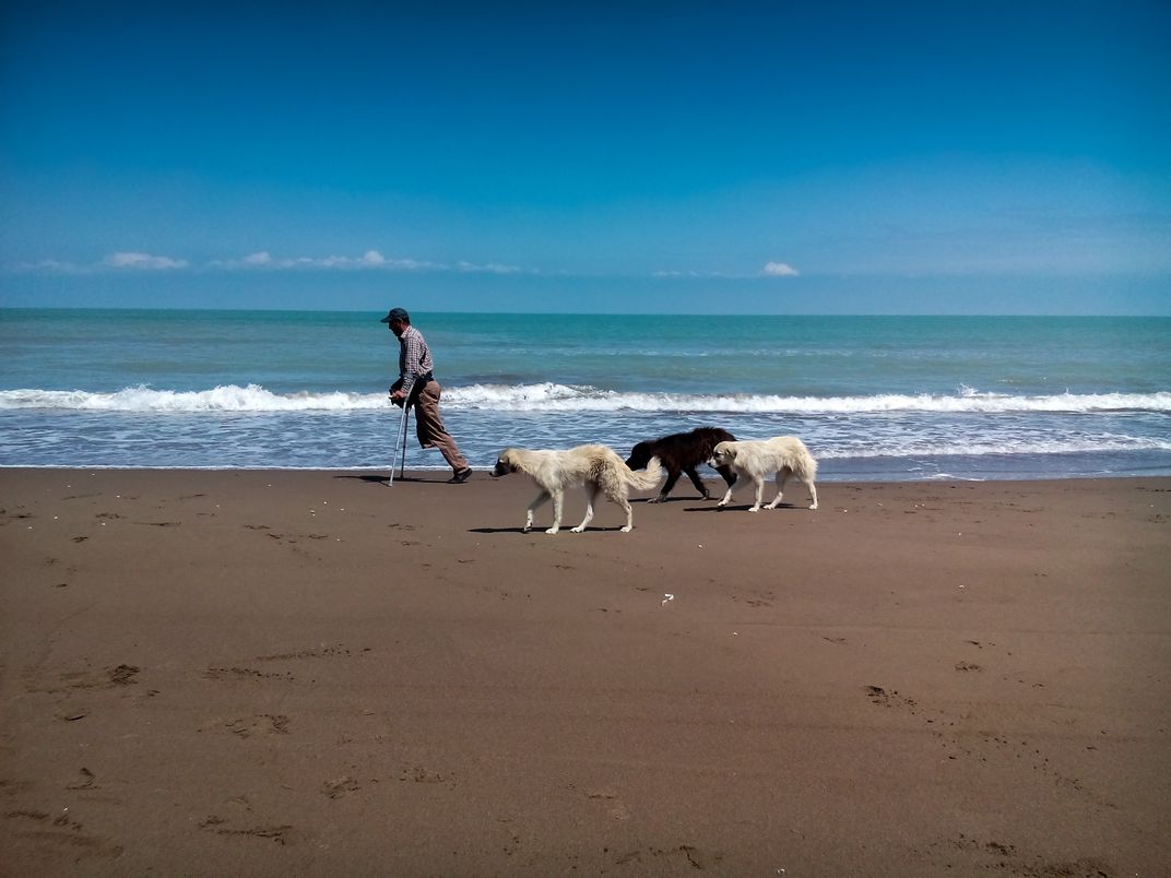 An Iranian man who lost his leg in the Iran-Iraq war is playing with beach dogs and is happy.
