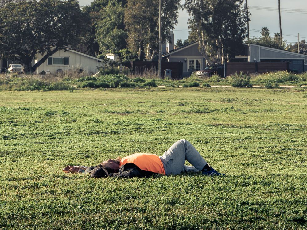 A man lies in a grass field of the Upper Newport Bay Nature Preserve in Newport Beach, California. Houses of the adjacent neighborhood can be seen in the background.