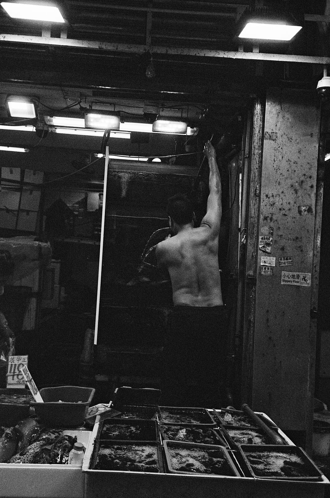 A man reaches up in his market stall. Fish is in front of him, and we see his bare back.
