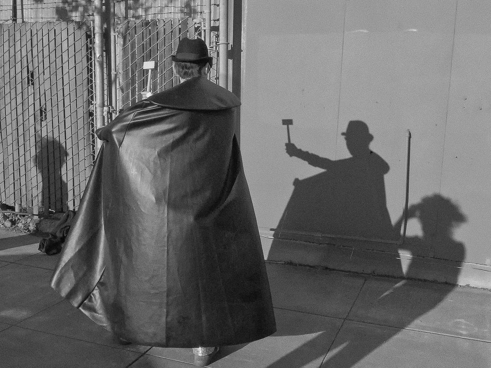 Photographed during a street photography walk in San Francisco’s SoMa district, this fleeting scene stopped me in my tracks — a man in a dark cloak whose shadow seemed to perform its own act against the wall of 1601 Indiana Street. The geometry of light, gesture, and anonymity turned an ordinary sidewalk moment into a small urban theater.