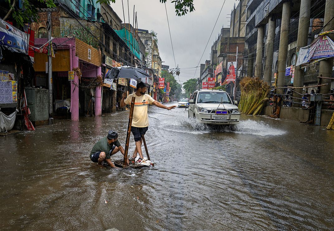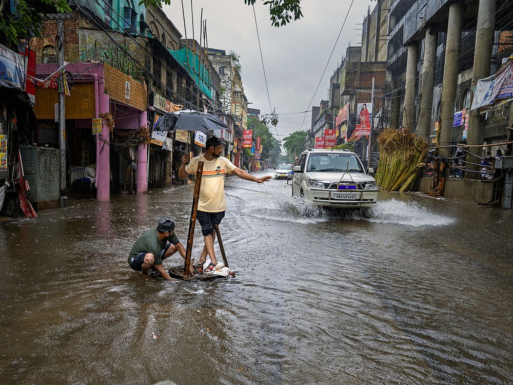 In heavy rain streets of the city kolkata were logged. The man with black umbrella was trying to open manhole so that water may pass away while police are passing in hurry and the man showing one hand to them for slow down the car , so that water may not splash on him.