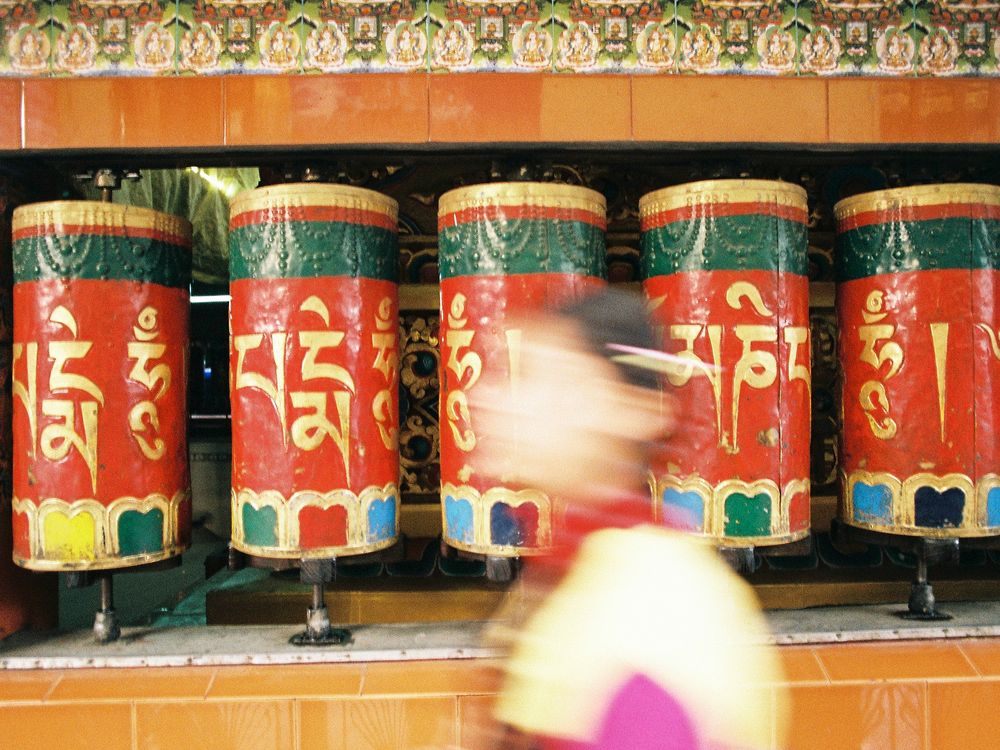 McLeod Ganj. India Tibetan Prayer Wheel and Tibetan woman. The Tibetans believe that the scriptures will be widespread if the manicha turns around.