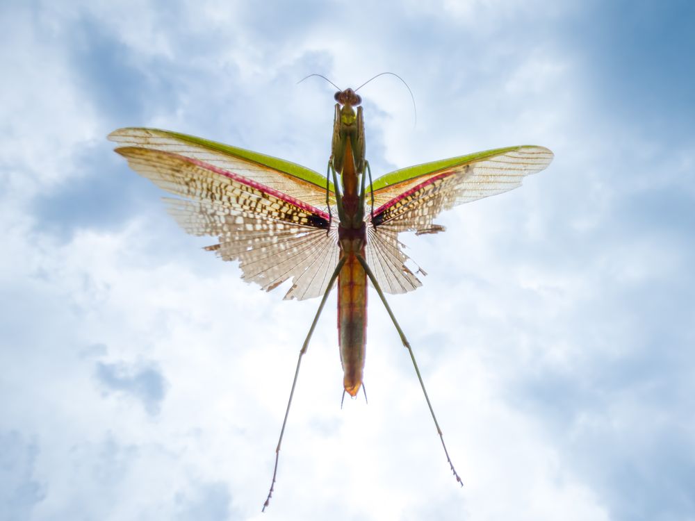 A wild mantis moves across a meadow in mid-air, its wings catching the light as it passes overhead. Seen from inches away with an ultra-wide perspective, the moment reveals a rarely witnessed view of an insect in motion.