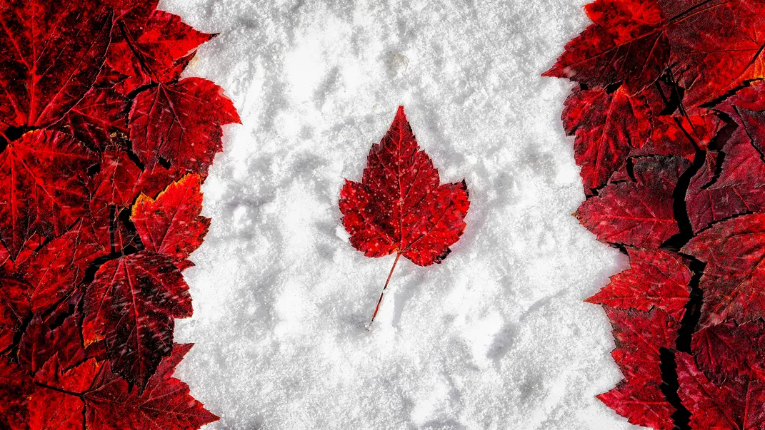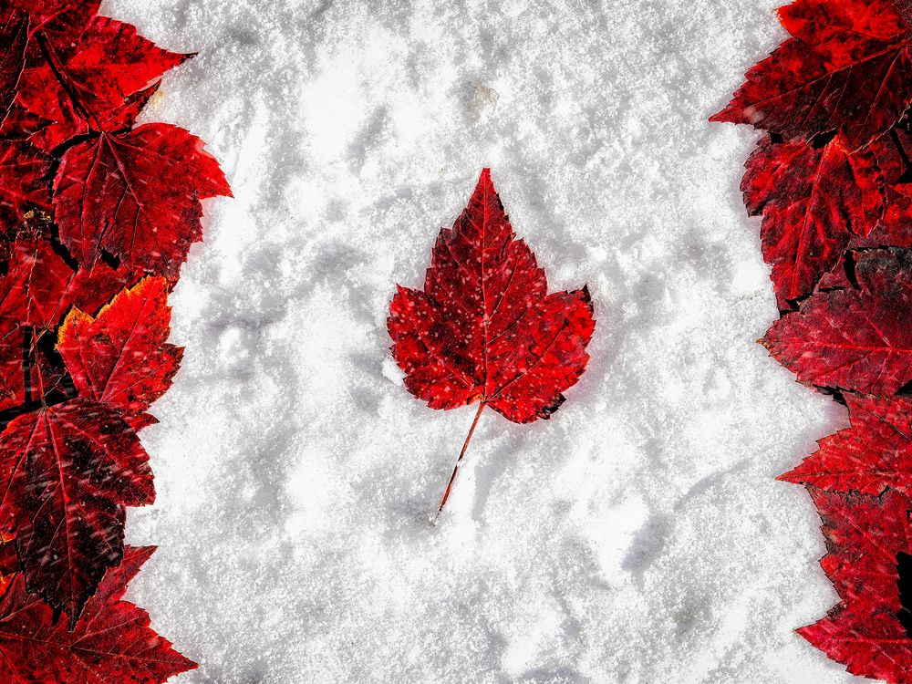 The picture is a creative photograph that uses red maple leaves on a snowy white background to form a representation of the Canadian flag. It is a symbolic representation of Canada, and its natural environment.