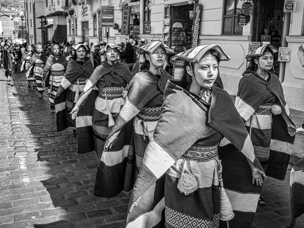 A group of women march in a parade in Cusco, Peru, during the Inti Raymi festival, the annual Incan festival celebrating the winter solstice.