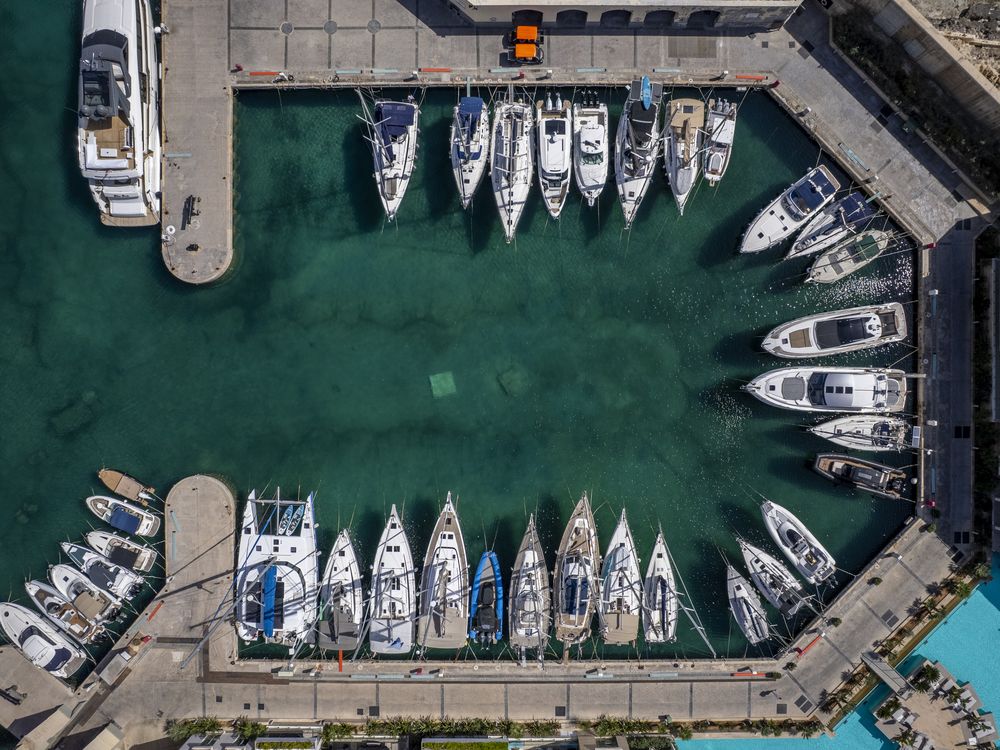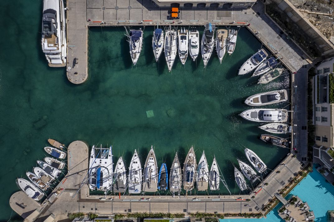 Boats of all sizes line the docks in this expensive marina. From above, the vessels form a perfect grid, their reflections shifting in the clear blue water as sunlight moves across the harbor.