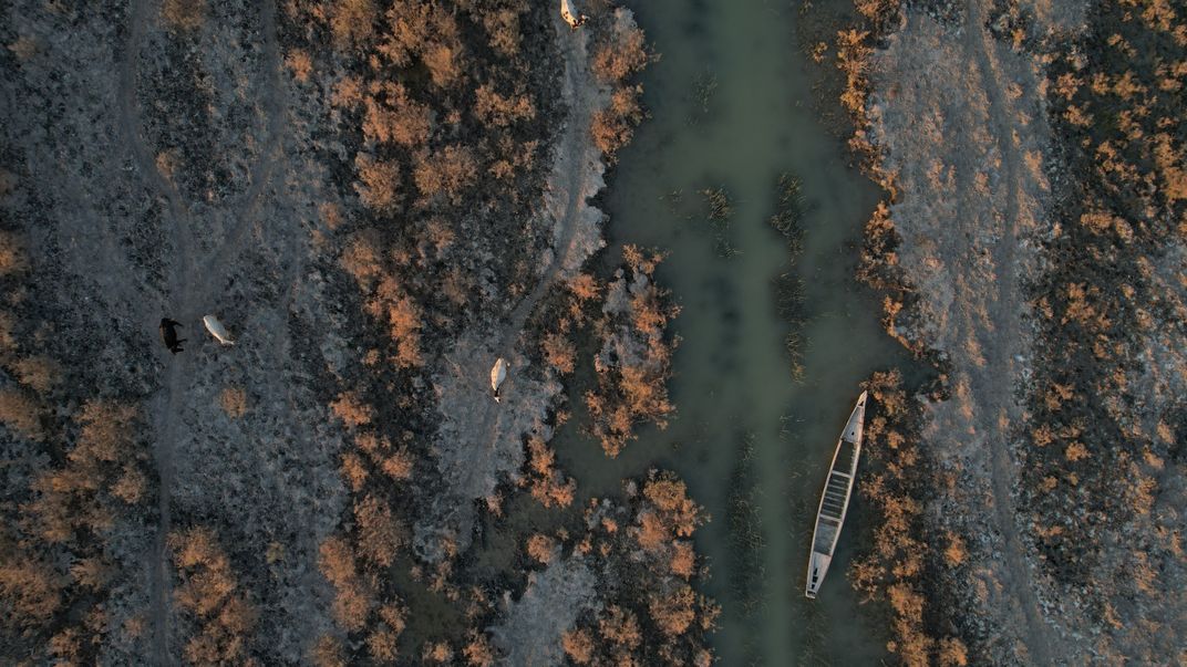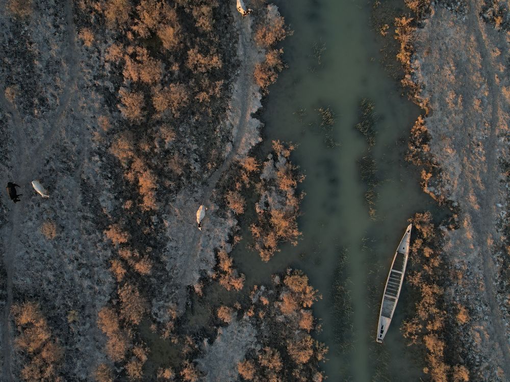 An aerial shot of the Al-Chibayish Marshes in Dhi Qar, Iraq, captures the severe drought threatening the traditional life of both people and wildlife. The waters that once flooded the area have turned into shallow pools surrounded by cracked land, as buffaloes and boatmen struggle to adapt to a new environmental reality imposed by climate change.