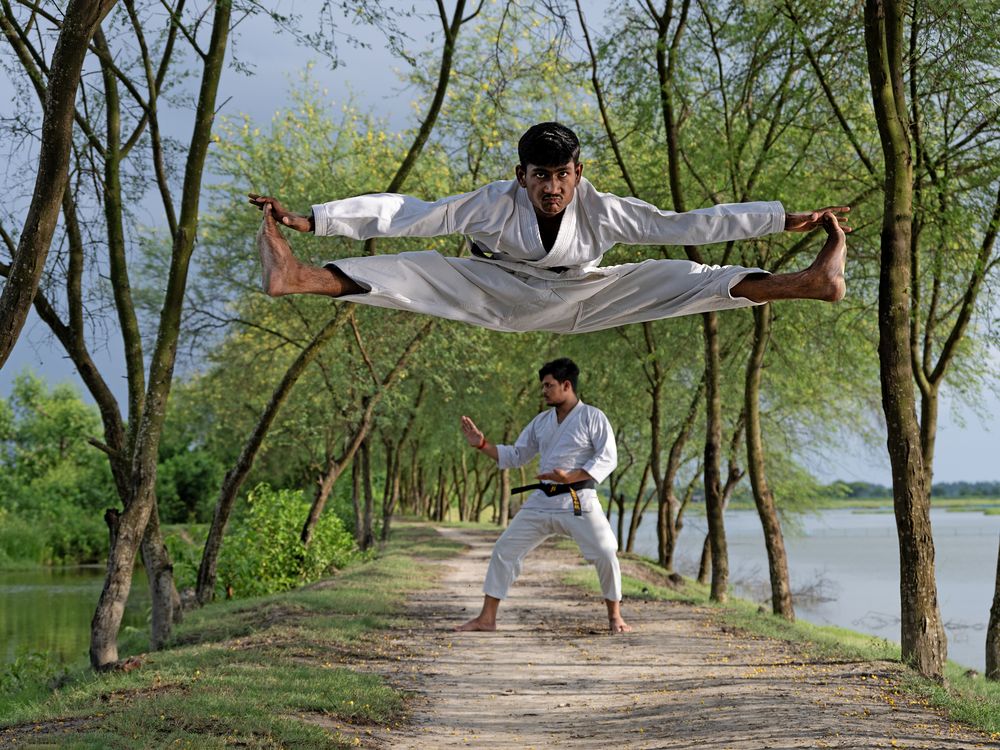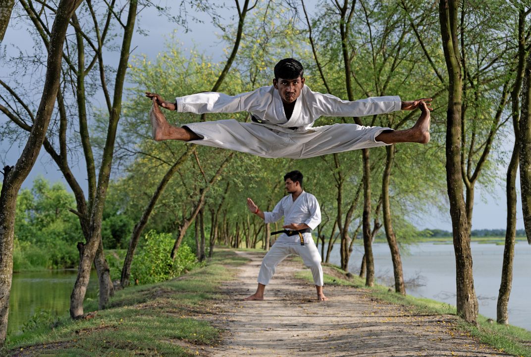 Two young men are practicing martial arts on a rural path surrounded by trees on an afternoon.