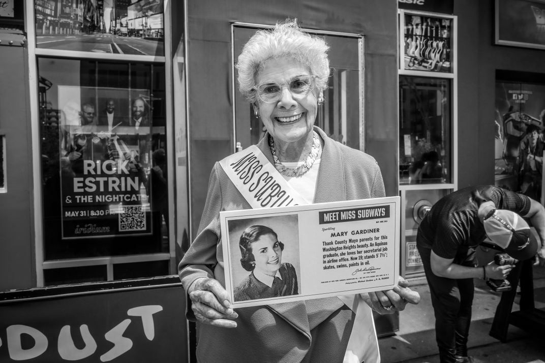 This is a portrait of Mary Gardiner at a Miss Subways reunion in 2024. Miss Subways was a bi-monthly title awarded to a woman living or working in New York City between the years 1941 and 1976. Posters of each winner were placed throughout the city’s subway system for a month or two. Mary is holding the poster used from her time as the reigning Miss Subways.