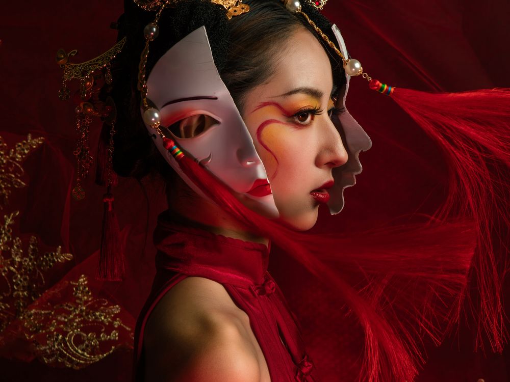 The image constructs a highly emotional and meticulously controlled space through the use of deep crimson. The profile of the subject is juxtaposed with a traditional opera mask, symbolizing the multiple roles that women are constantly assigned to fulfill within social and cultural structures. The mask is not merely a cover, but an existential state shaped by prolonged wear, gradually merging with the face itself. Elaborate headpieces and thin gauze signify the state of "being observed," turning the body into a site that carries expectations and norms. Through fragmentation, overlap, and stillness, the photo explores the tensions between self-perception and external gaze in the formation of female identity, as well as the internal fractures that arise from the continuous performance.