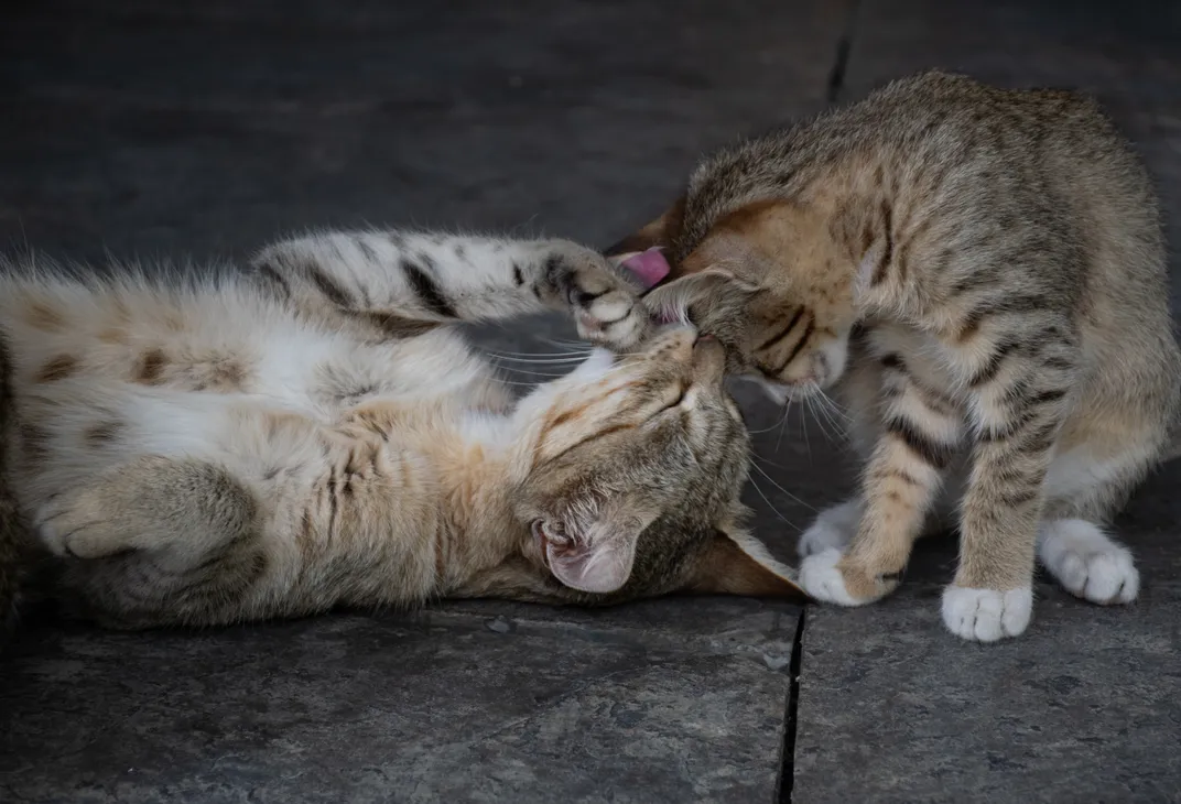 After nourishing her kittens, the mother gently grooms them — a quiet reflection of pure maternal instinct.