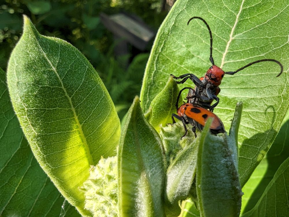 While visiting the Botanical Gardens of Asheville, I came upon a plant that was hosting a pair of Red Milkweed Beetles, presumably trying to figure out how to engage in a mating dance. I took a few more shots of them, but only one looked remotely like an actual mating ritual. (Or was one of them just playing hard to get?) Just to play it safe, I will submit a separate entry with the other one as well.