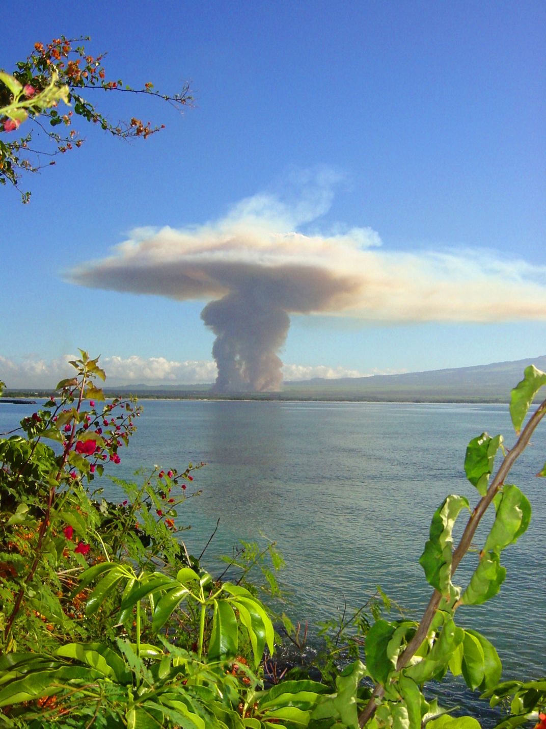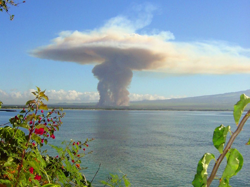 Maui sugar cane fire meets tradewinds for a mushroom cloud effect