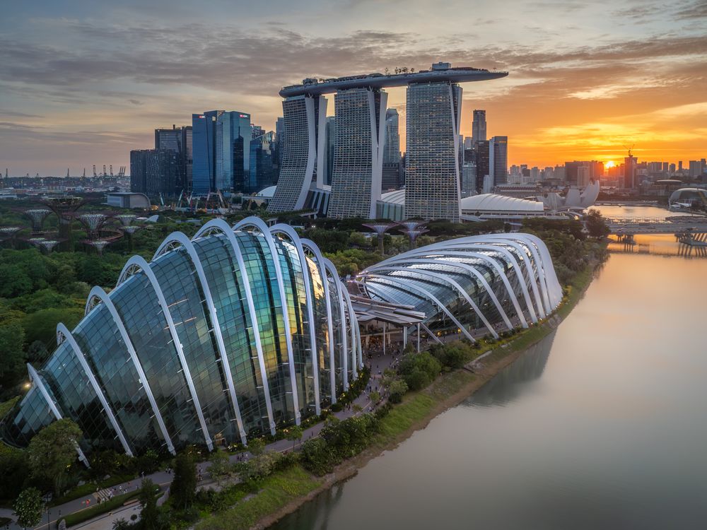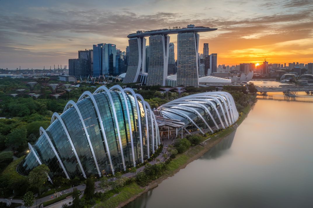 A drone shot taken at beautiful dusk conditions captures the two shimmering conservatory domes of Gardens by the Bay in the foreground, their smooth glass curves catching the last light. Behind them, Marina Bay Sands rises elegantly into the evening sky, forming a skyline instantly recognizable as iconic Singapore. This powerful blend of futuristic design and curated nature not only defines the city’s visual identity but also helps attract global tourism to the resource-poor city-state, showcasing how innovation can shape both experience and economy.
