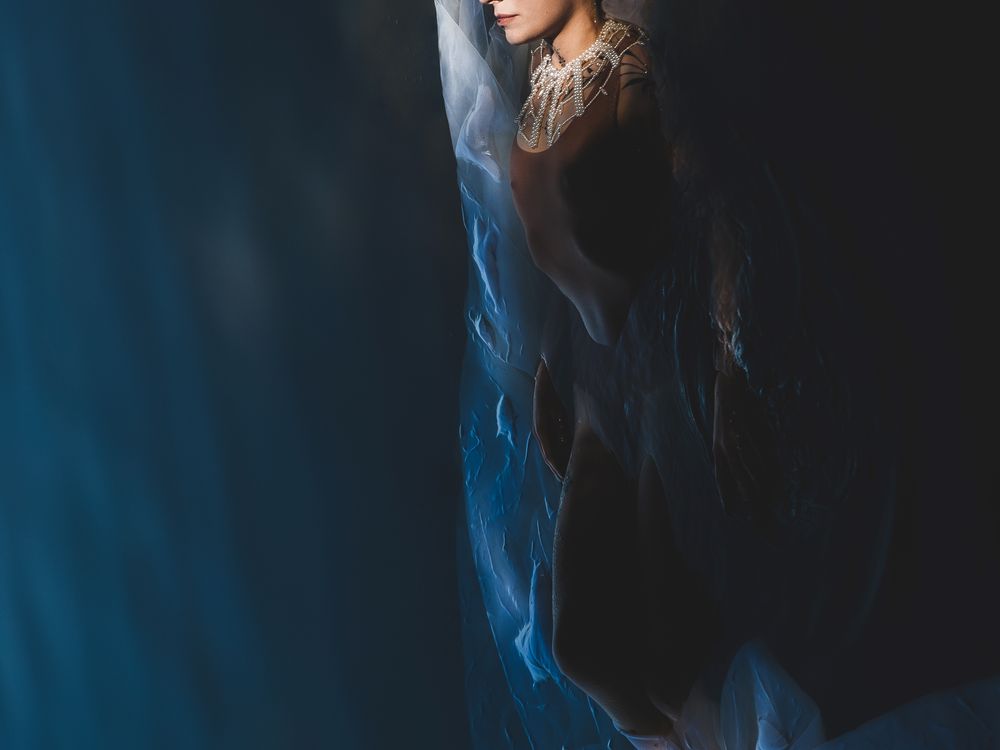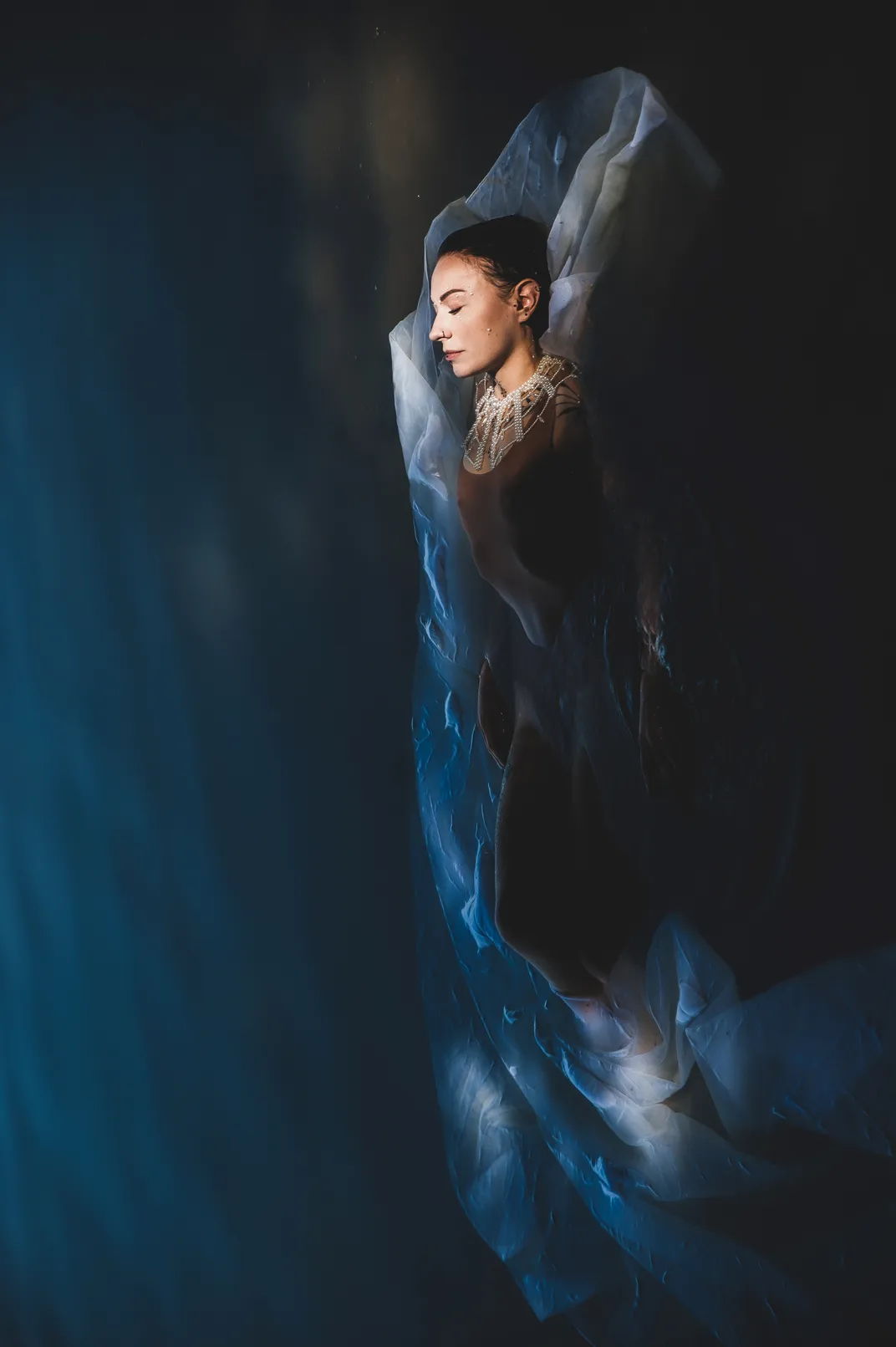 A woman floats effortlessly in the deep blue, suspended in a tranquil underwater world that feels as vast as space itself. Sunlight filters through the surface above, scattering like distant starlight as she meditates in perfect stillness. The scene blurs the line between ocean and cosmos, a weightless moment of peace where water becomes the universe around her.
