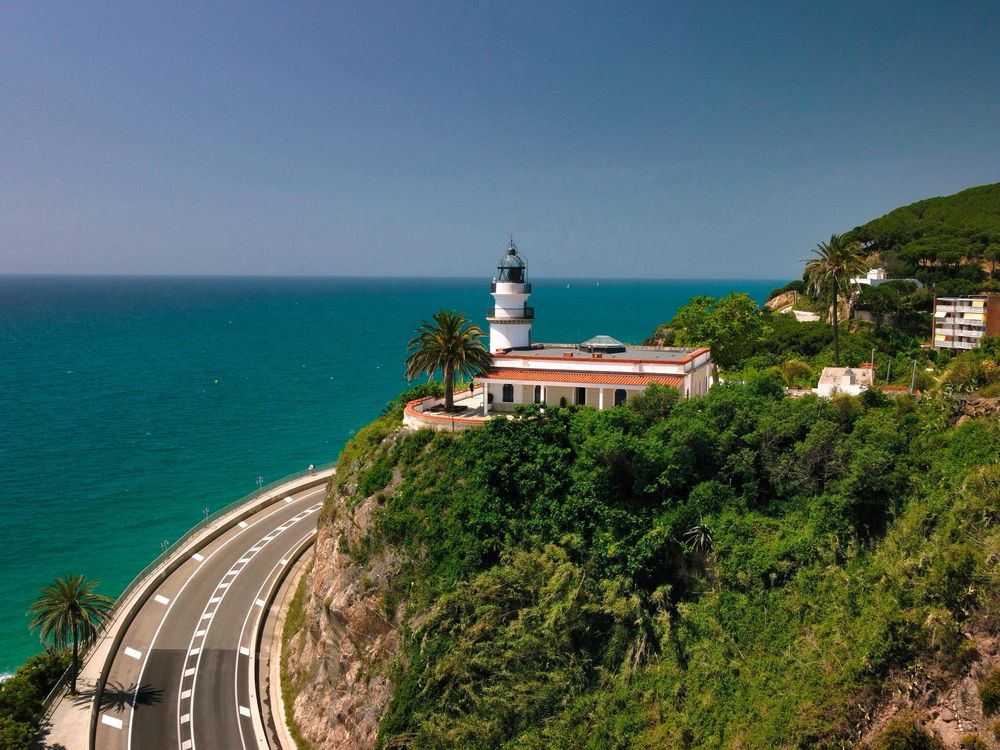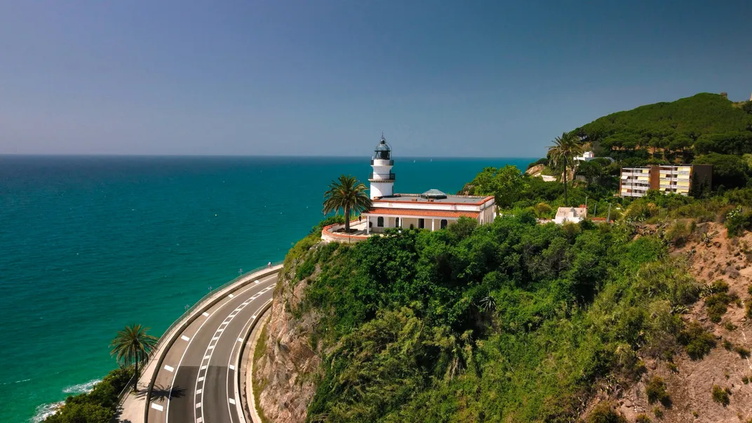 The Calella Lighthouse (Faro de Calella) watches over the vibrant Mediterranean Sea in Spain. This drone shot highlights its stunning cliffside position, with the coastal highway gracefully curving around the base of the hill.