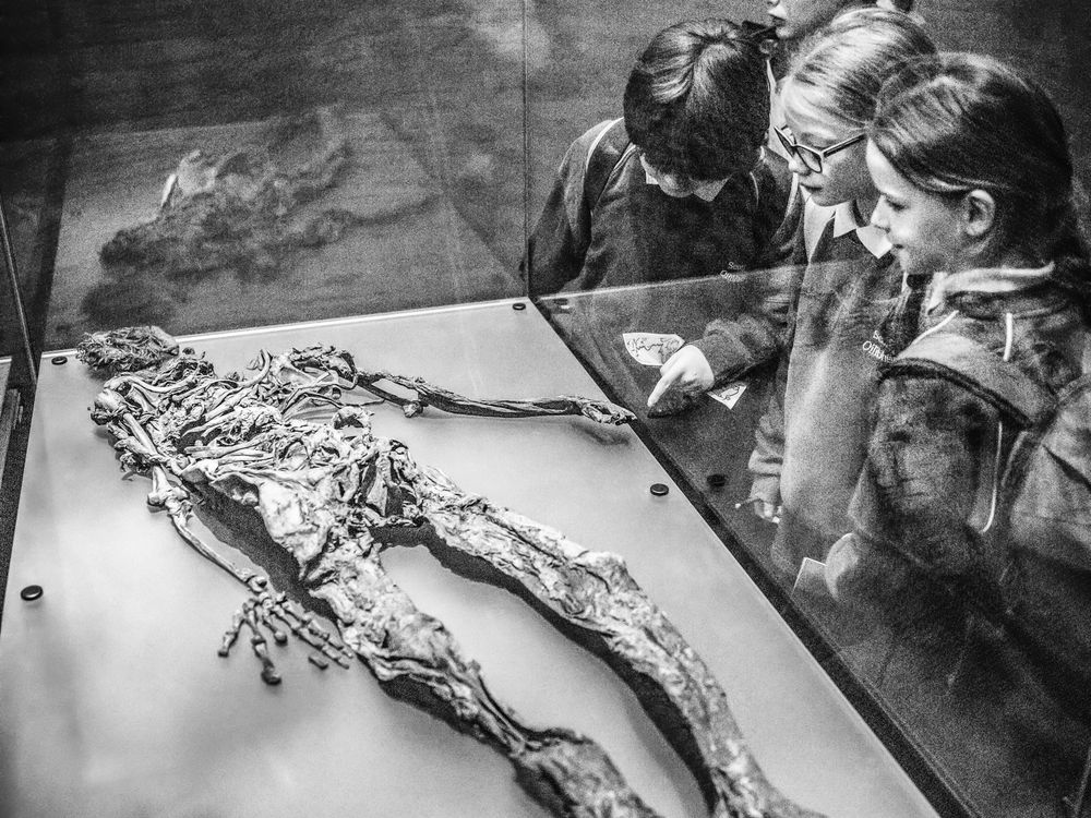 A group of school students on a class trip gingerly inspect the skeleton of one of the Bog Men in a museum in Dublin, Ireland.