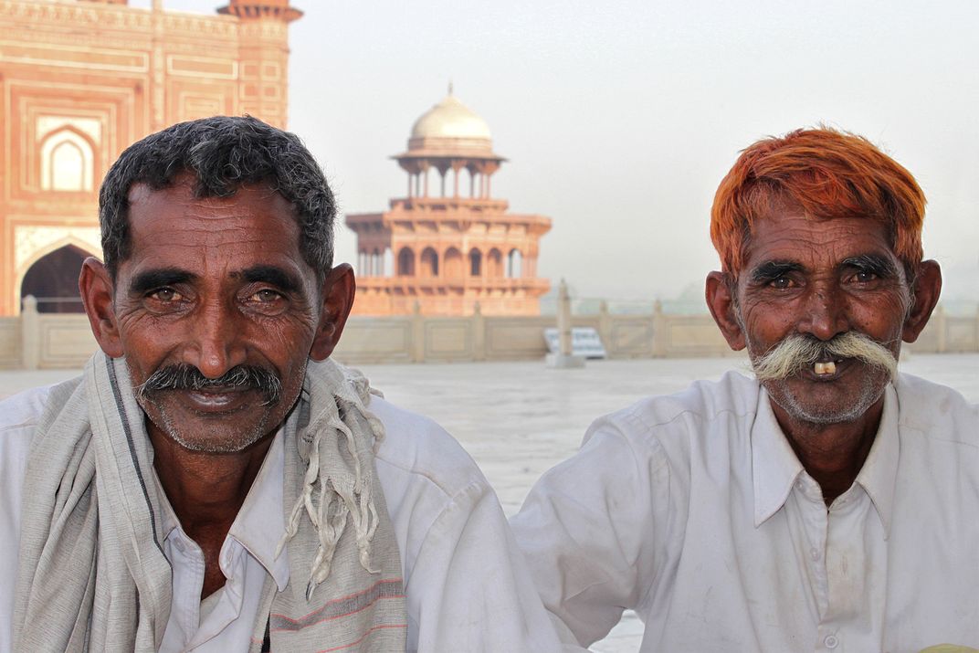 Men enjoying some shade on the grounds of the Taj Mahal.