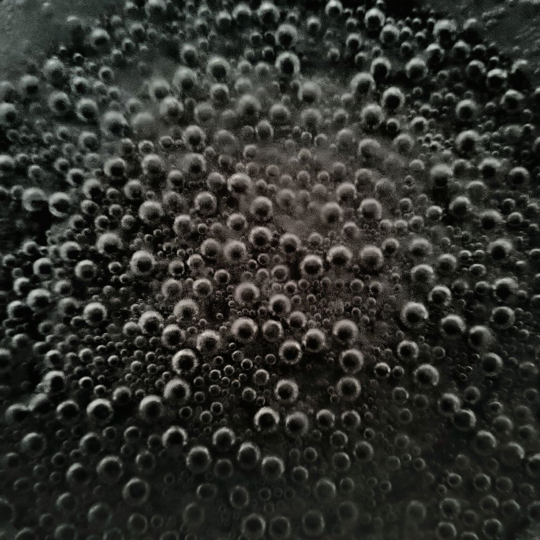 A macro photograph of tiny bubbles forming on a dark surface. Viewed up close, the clustered circles create an abstract pattern that resembles a miniature universe.