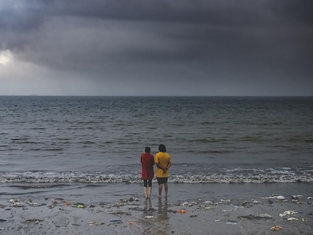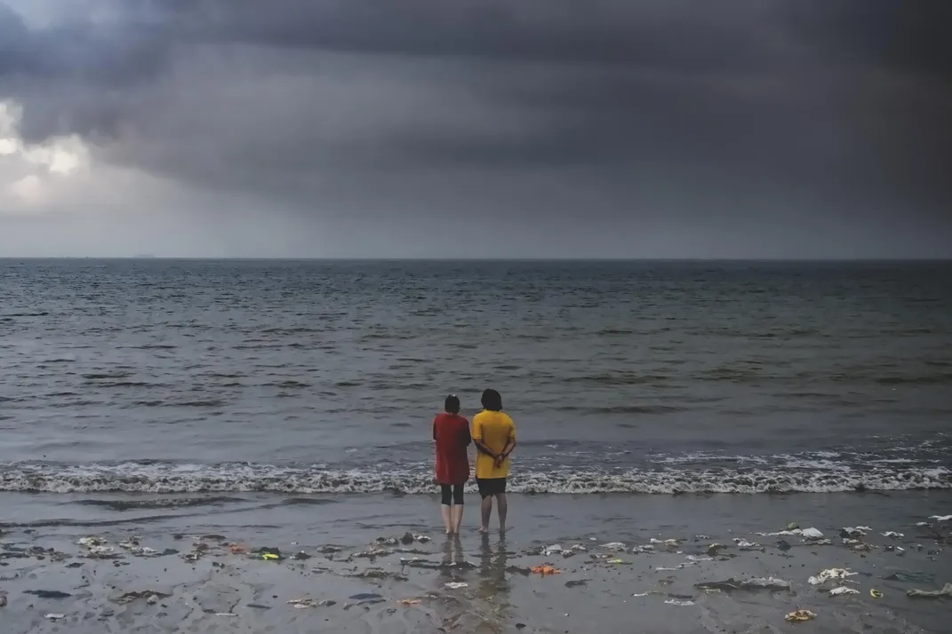 Two figures stand side by side at the edge of the Arabian Sea, dressed in bright red and yellow against a brooding storm front. At their feet, waves curl around a littered shoreline, plastic and debris underscoring the scene. Their togetherness and the dramatic sky evoke romance, but the beach itself tells a more complicated story about love and neglect.
