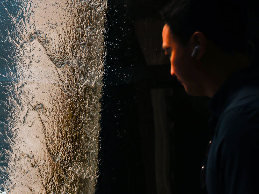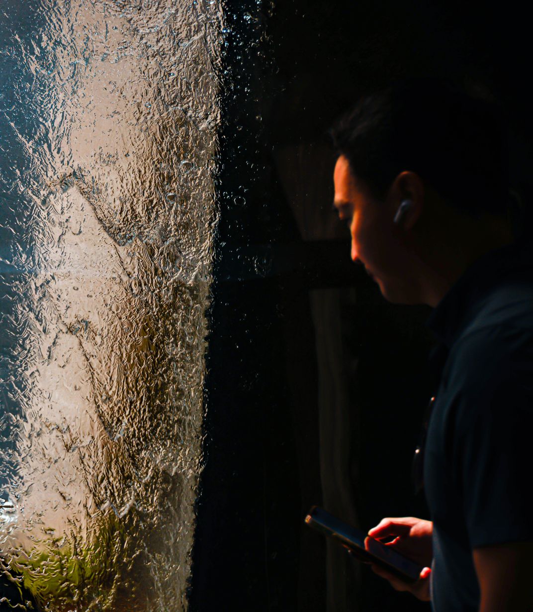 There is a water tunnel that connects two streets in midtown Manhattan. One walks into an open tube with water flowing around each entrance as well as the full extent of the tube. The passage transports all the travelers literally from street to street but allows some to move figuratively from dimension to dimension. Some find it an experience, pausing to participate, while others seem untouched and remain in their own space as they move. This is one of a series capturing both.