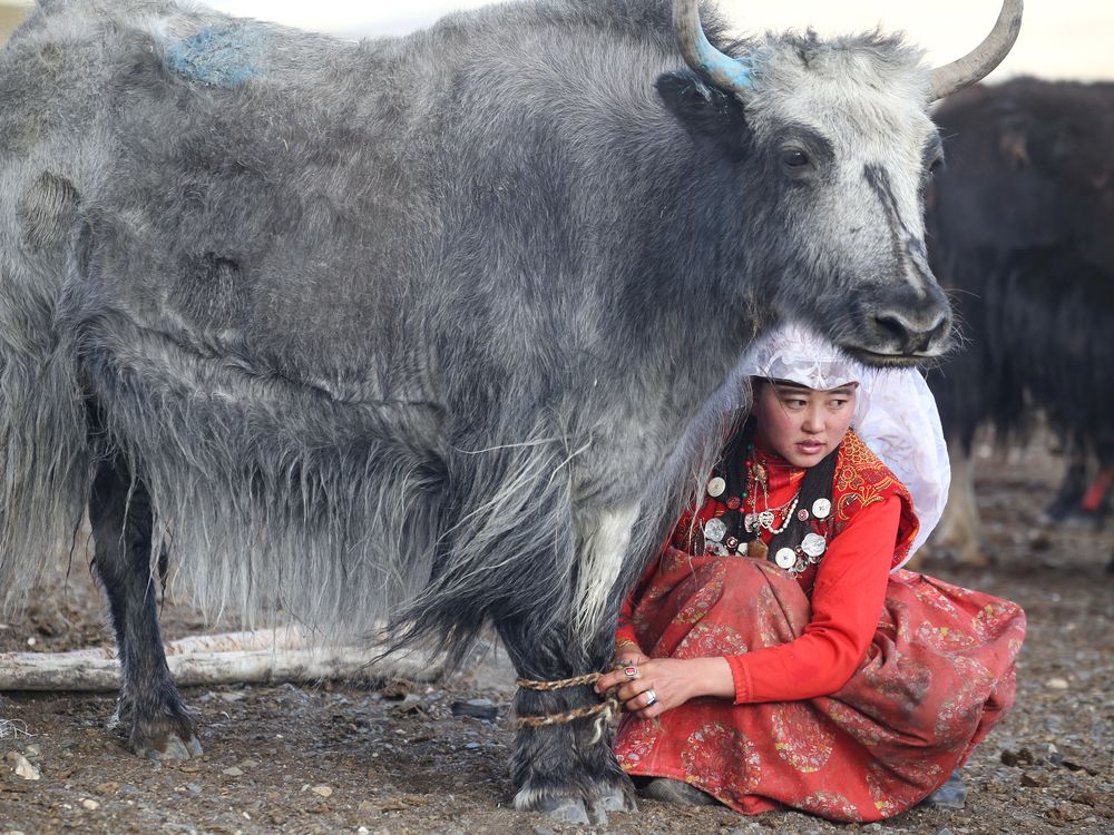 Kyrgyz woman milks a yak in Karchyndy encampment, Little Pamir, Afghanistan