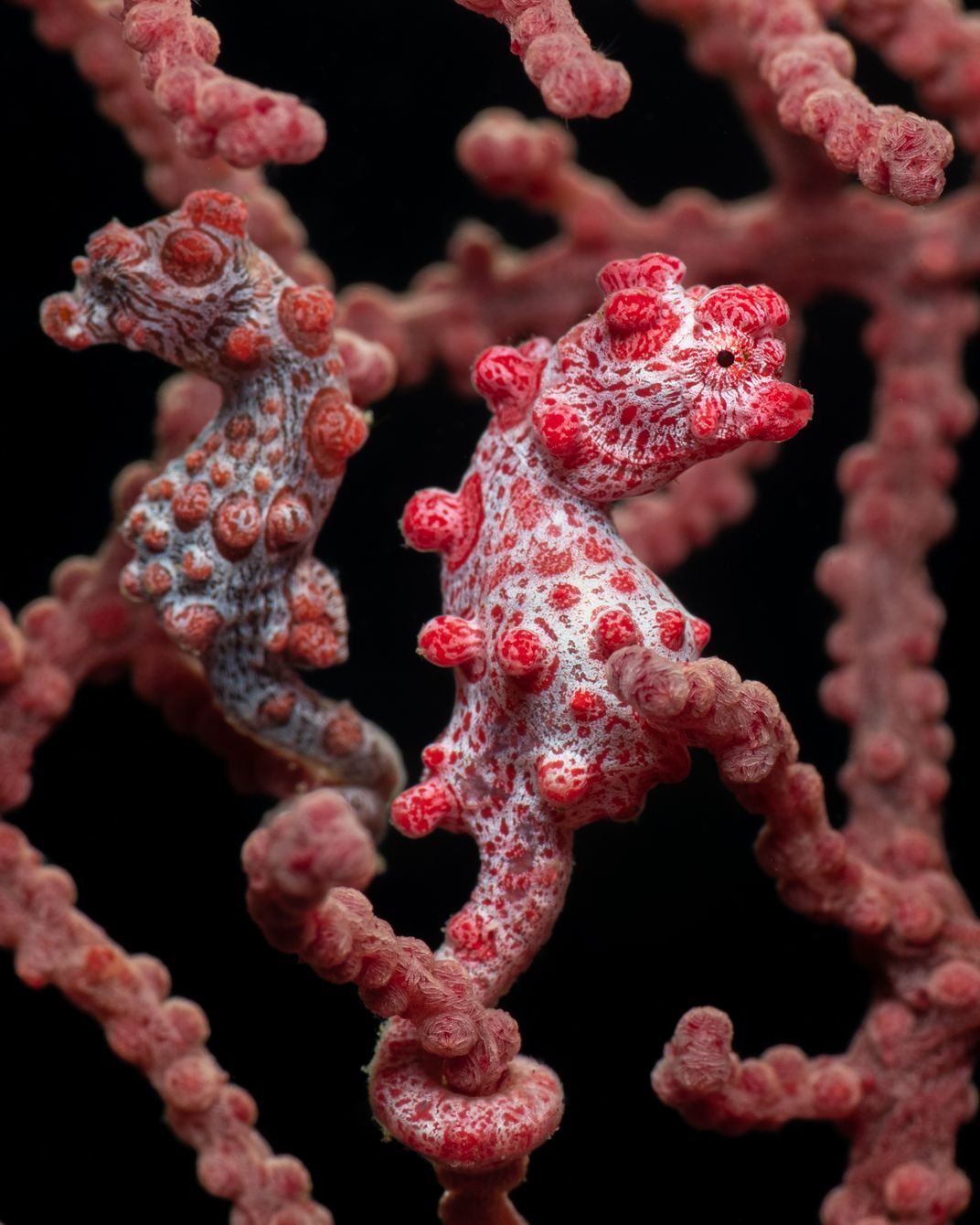 A pair of Bargibant's pygmy seahorses camouflaged on a Gorgonian Sea Fan at the Lembeh Strait, Indonesia.