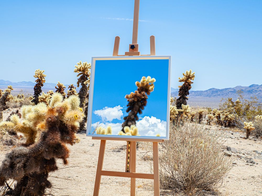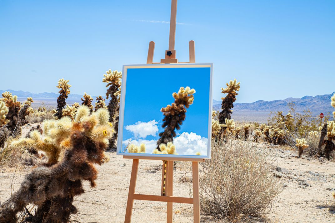 A framed mirror sits on an easel in a sun-bleached desert filled with cholla cacti. The mirror reflects a single cactus rising into a deep blue sky with soft white clouds, perfectly aligned with the actual cactus standing just behind it. The visual creates the illusion of a hyperreal painting, as if the cactus has been plucked from its environment and placed inside the frame. The surrounding landscape stretches out toward distant mountains, reinforcing the contrast between the wild, open desert and the contained, curated reflection. The image captures a fleeting moment where nature becomes its own artwork.
