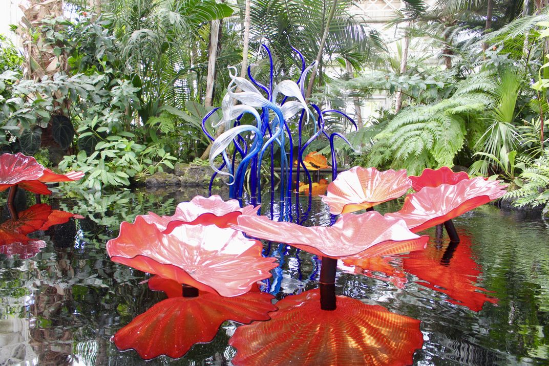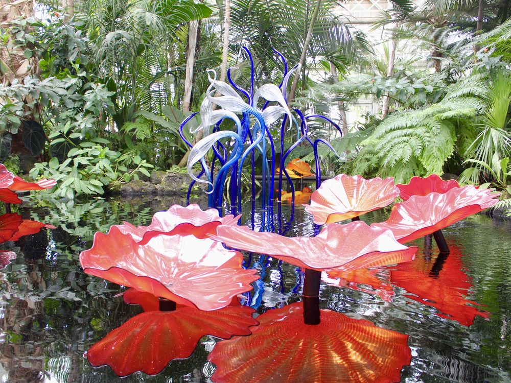 Glass sculptures and their reflections in water at the NY Botanical Gardens.