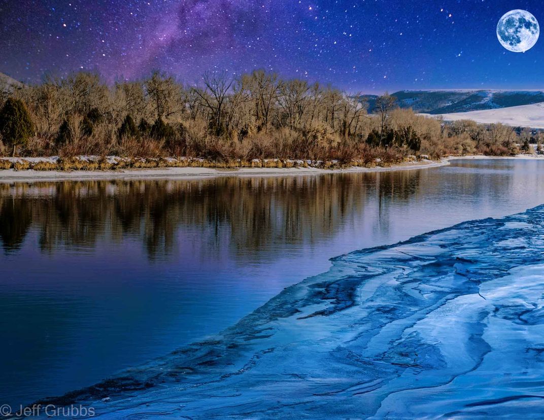 Icy winter evening on the Snake River in Idaho as the Milky Way passes over and the bright full moon provides light to reflect the trees on the river as it slowly flows by.