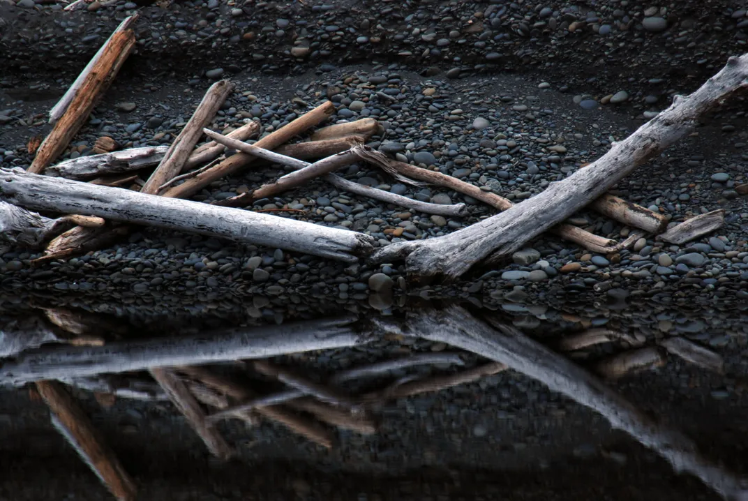 Mirrored driftwood and rocks on a windless evening at Ruby Beach, Washington.