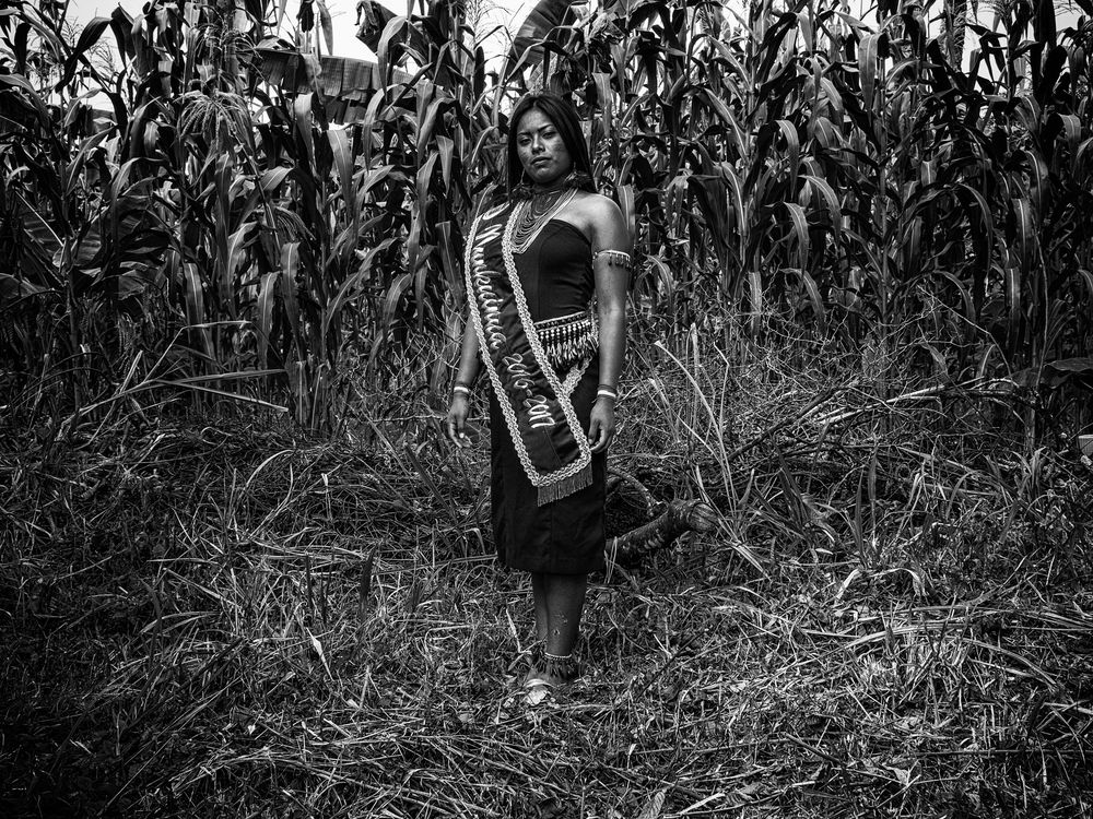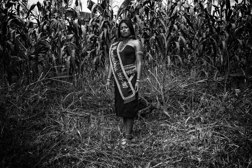 Fernanda Tzamarendia, 17, poses for a photo in the corn fields next to her home in Sucúa. Winner of the Miss Nunkuinua (woman grower) 2016 award. Miss Nunkuinua is an Ecuadorian Amazonian beauty pageant from the province of Morona Santiago. The myth of Nunkuininua speaks of a girl who has powers to produce food for the Amazonian People as long as the girl is respected, a symbol of the fertility of the land.