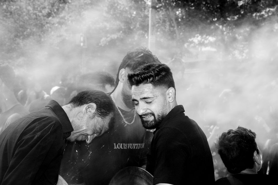 Captured during the Ashura ceremony in Sabzevar, Iran. Due to the scorching summer heat and the dense crowd of mourners, water is sprayed into the air to cool the people down. This candid moment captures the immediate physical relief on the faces of the men as they are enveloped in the cooling mist. The water vapor creates a dreamlike atmosphere, blending the intensity of the ritual with a fleeting moment of comfort.