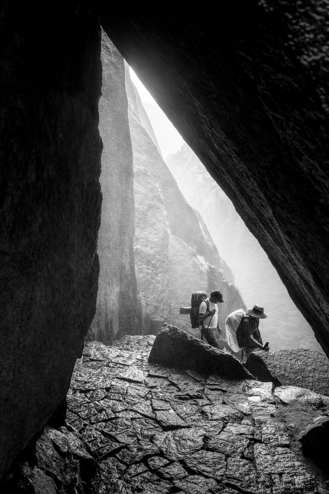 Hikers can be seen through an opening in a cave as they descend the Mist Trail in Yosemite National Park. The trail leads hikers to the tops of Vernal and Nevada Falls. When water levels are high enough, portions of the trail which lead hikers close to Vernal Fall are covered in mist from the waterfall.